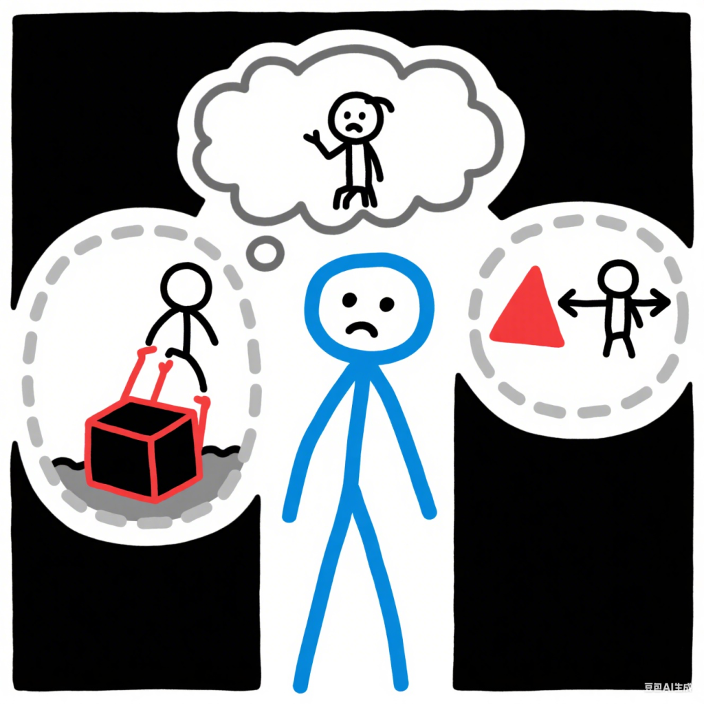 情感体验的“隔阂感”: 感受到的情绪(如强烈的羞耻、莫名的恐惧)似乎不属于“真正的我” ,更像是在扮演某种角色或承载着不属于自己的重负。